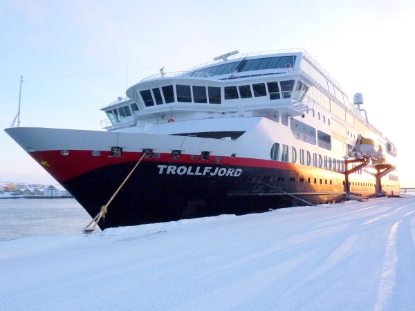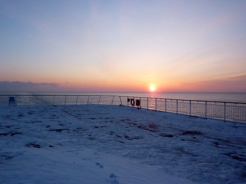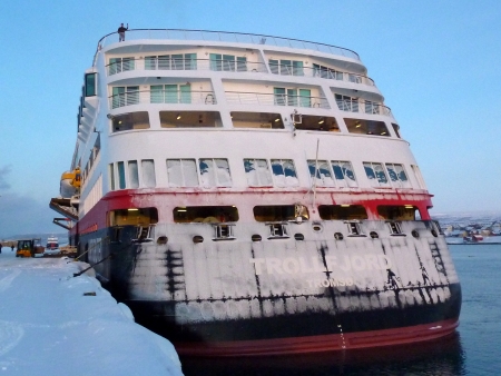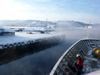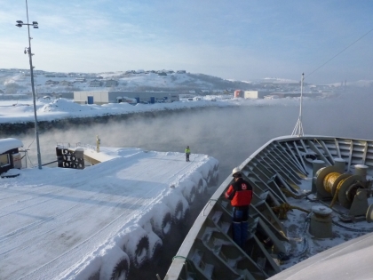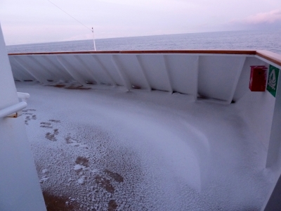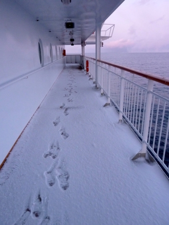 Um kurz vor 7Uhr startete ich meine obligatorische Runde ums Schiff und stellte fest, dass es in der Nacht erneut geschneit hatte. Die aktuelle Temperatur lag bei -8°C.