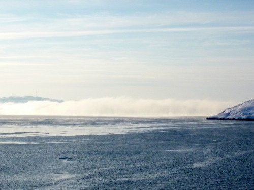 Gegen 9.30Uhr konnten wir direkt vor uns eine dicke Nebelwand über dem Wasser sehen, so wie ich das schon von meiner Spitzbergen Reise her kannte. Der Anfang ist scheinbar wie mit einem Lineal gezogen...