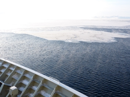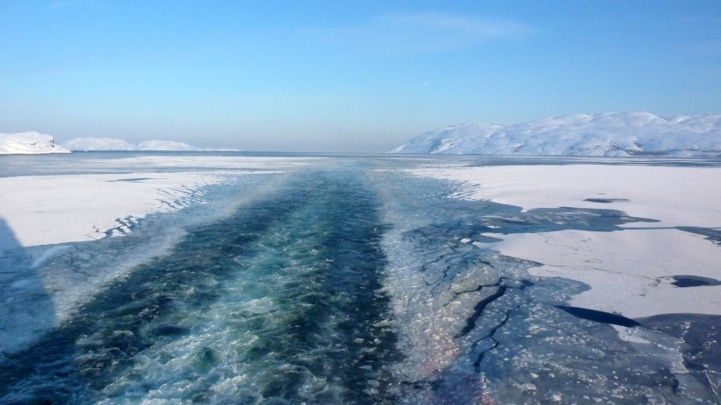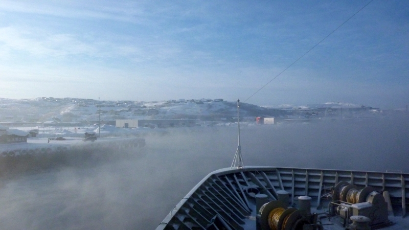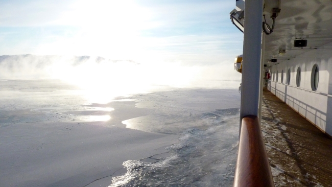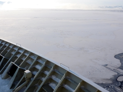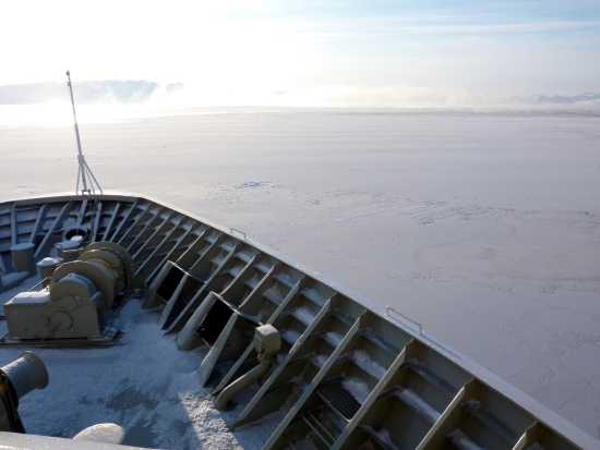 Kurz darauf fuhren wir durch eine Eisschicht, die sich auf dem Wasser gebildet hatte - es knirschte und hin und wieder rumpelte es, wenn ein Eisstück gegen den Bug schlug.