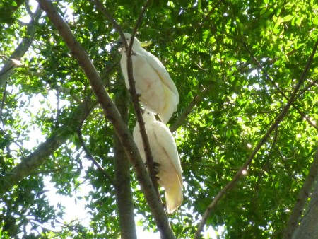 Auf manchen Bäumen schwatzen lautstark verliebte Kakadus.