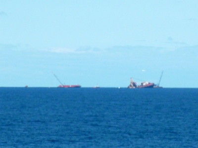 großer Entfernung das Wrack des Containerschiffes Rena, welches