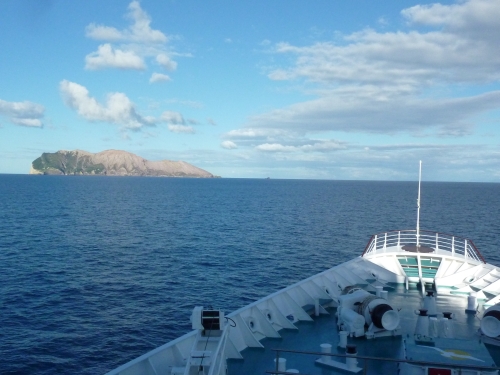 Aus den Fumarolen entweicht schwefeliger Dampf, den wir auf dem Schiff noch gut riechen können.