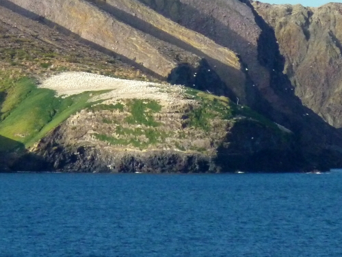 An den bewachsenen Hängen lebt eine große und lautstarke Tölpelkolonie.