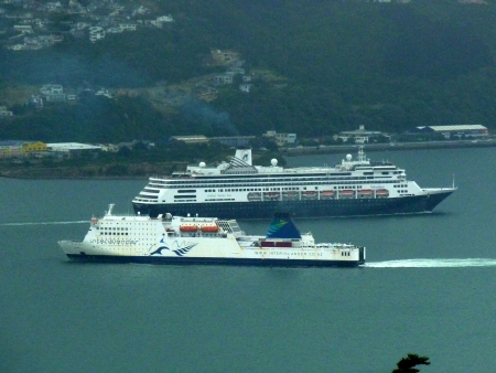 Von hier oben konnten wir die Abfahrt der Volendam sowie der ankunft einer Fähre beobachten. Von wellington aus verkehren zwei Fährunternehmen (Blue Bridge, Interislander) zur Südinsel (Picton).