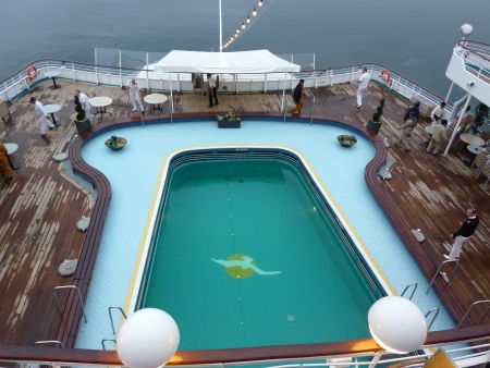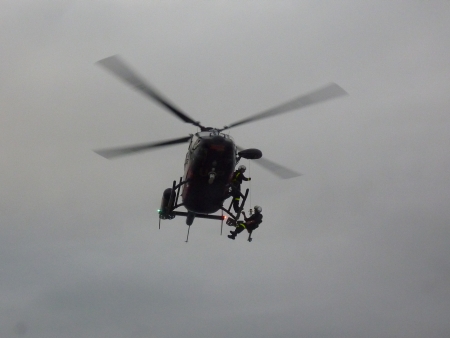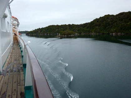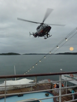 Als ich um 7Uhr am Heck frühstückte begann plötzlich eine hecktische Betriebsamkeit und das Deck wurde ohne Grund geräumt. Diesen konnten wir aber schon bald lautstark hören und auch sehen. Ein Helikopter vom Festland brachte einen erkrankten Passagier ins Hospital.