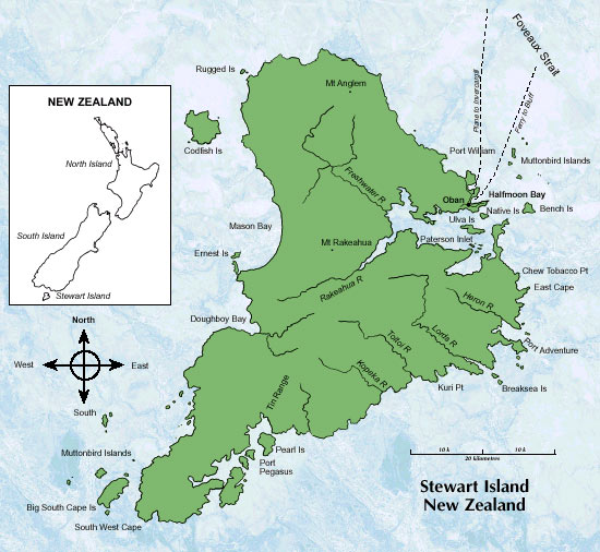 Stewart Island (Rakiura) ist die drittgrößte Insel Neuseelands und mit 1.680 km² etwa 2/3 so groß wie das Saarland. Bis zum Festland der Südinsel sind es etwa 30km und es gibt einen täglichen Fährbetrieb.