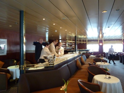 Wir wurden durch den Hotelmanager begrüßt und freundliche Crewmitglieder schnappten sich unser Handgepäck, um es auf die Kabine zu bringen. Wir wurden allerdings zuvor in die Explorer Lounge zum Champagner-Empfang gebeten. Hier bekamen wir auf unsere Bordkarte einen kleinen Farbaufkleber (gelb), der unsere Zodiacgruppe anzeigte.