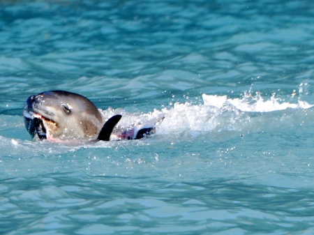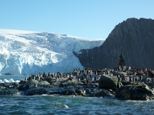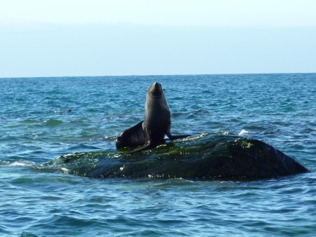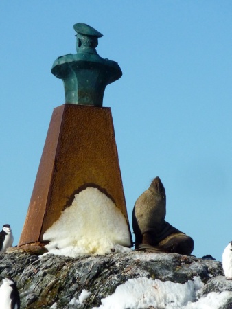 Ehrfurchtsvoll scheint die Pelzrobbe das Denkmal anzuschauen.