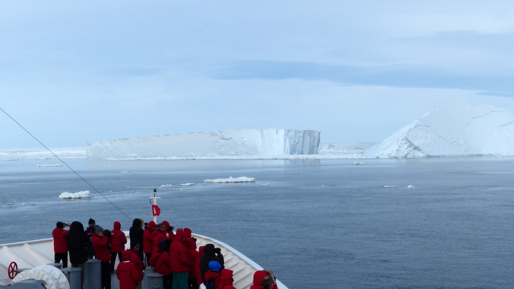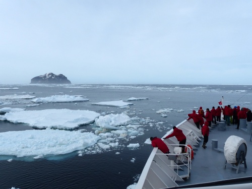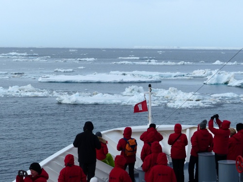 Nach einem kleinen Eisfeld befinden wir uns im Weddell-Meer. Dieses ist das größte der 14 Randmeere am antarktischen Kontinent. Der westliche Teil ist ständig mit Packeis bedeckt und je nach Wind auch bis hin zum antarktischen Sund in der Sommerzeit. Auch wir werden nun von Kapitän Wolter darüber informiert, dass das Packeis uns den Weg zur geplanten Landung in Paulet Island versperrt. Ein Alternativprogramm wird schnell entwickelt und wir fahren nun erstmal an Andersson Island vorbei.