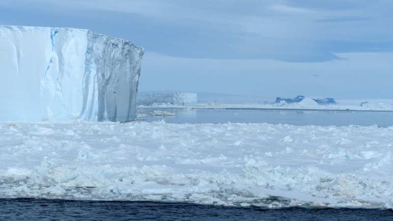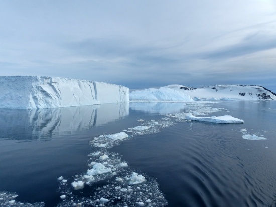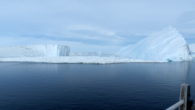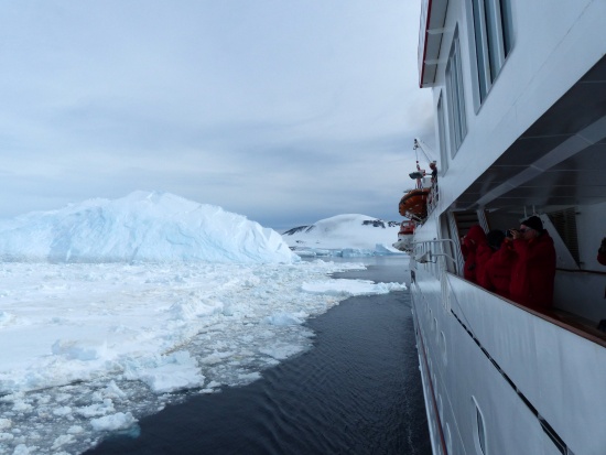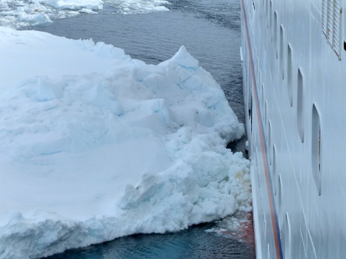 Immer wieder kommen uns gigantische Tafeleisberge entgegen daher wird dieser Sund auch "Allee der Eisberge" genannt. Grund ist der im Winter um die Antarktis gewachsene Eispanzer bricht im Sommer nur teilweise auf. Von der Strömung in der Wedellsee werden abgebrochene Teile ständig heran getrieben. Durch den Wind ändert sich die Eissituation ständig.