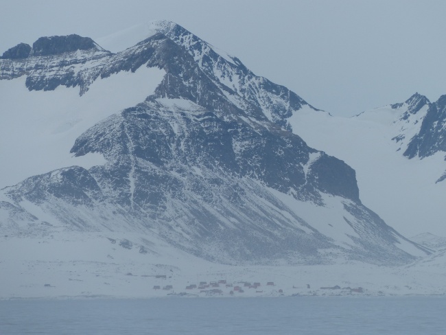 Gegen 9.15Uhr passieren wir die im Nebel auftauchende argentinische Station Esperanza (Hoffnung), die an der Hope Bay auf der Trinity Halbinsel liegt. Sie wurde am 17. Dezember 1952 von Kapitän Jorge Edgar Leal gegründet und seitdem in Betrieb. 43 Gebäude bedecken eine Fläche von ca. 3.744 m².