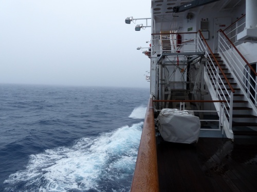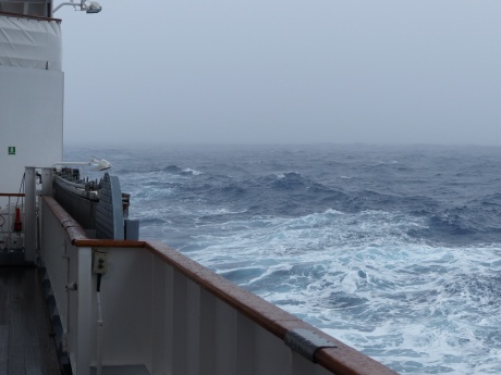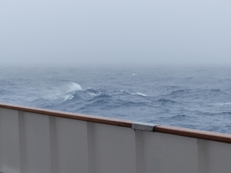 Heute war ein sehr schaukeliger erholsamer Tag. Wir fahren mit ca. 13kn durch die wolkenverhangene Drake Passage. Die Lufttemperatur beträgt 5°C und die des Wassers 2°C. Wir haben eine Wellenhöhe von 4m und der Wind bläst mit Stärke 7 aus SW-Richtung.