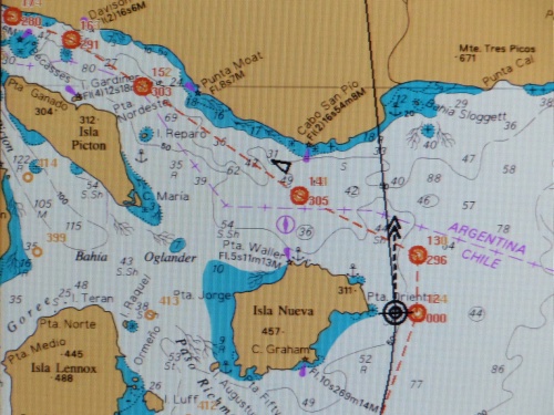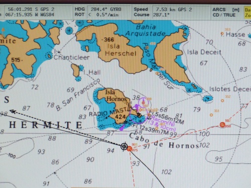 Der Wind weht mit 35kn und in Böen mit bis zu 50kn als wir kurz auf die Isla Hornos mit dem berühmt Kap genommen haben.