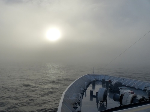 Am heutigen Seetag ist es recht neblig und windig. Wir fahren einen Generalkurs von 96° und haben eine Geschwindigkeit von 13,5kn. Der Wind kommt von achtern und hat eine Stärke von 4 Beaufort. Die maximale Wellenhöhe beträgt 2m. Um 9Uhr ist die Außentemperatur 7°C und die Wassertemperatur 6,5°C.