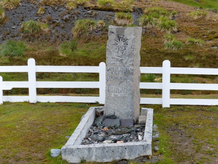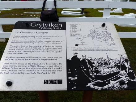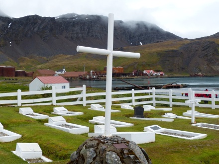 Der Grund warum wir hierher kommen, ist dass einer der berühmtesten Polarforscher und Entdecker Ernest Shackleton hier begraben liegt. Er starb am Morgen des 05. Januars 1922 an einem Herzinfakt. Mit dem Dampfer Woodville wurde er nach Grytviken gebracht wo er am 05. März nach kurzer Andacht in der lutherishcen Kirche beigesetzt wurde. Schiffsarzt Alexander Macklin schrieb in seinem Tagebuch: "[Ich] denke, das ist es, was "der Boss" für sich selbst gewollt hätte. Allein auf einer Insel fernab der Zivilisation, umgeben von der stürmisch tobenden See in der Nähe einer seiner gößten Heldentaten".
