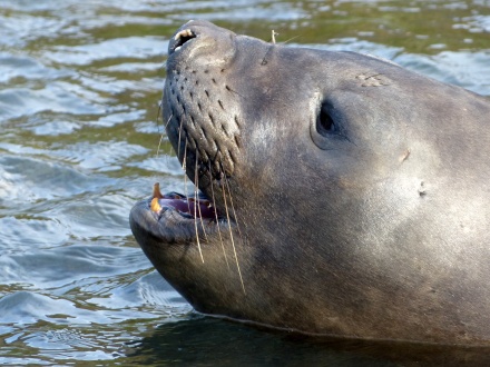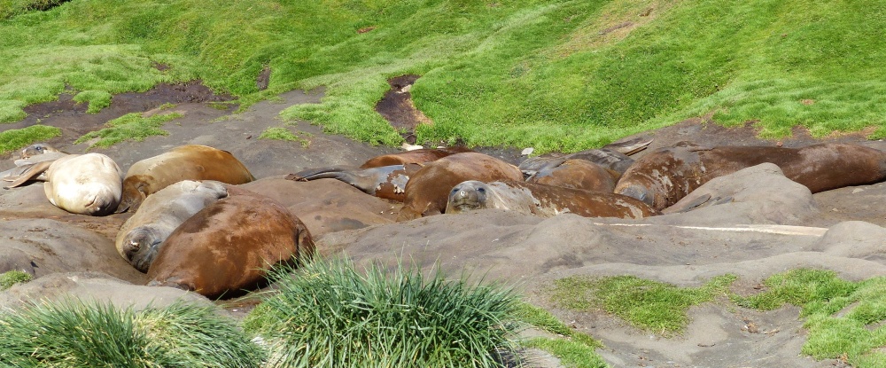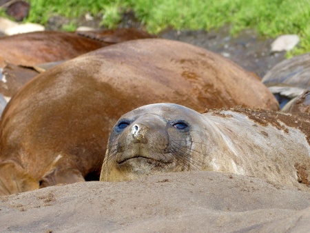 Auch Seeelefanten genießen bei der Sonne den Fellwechsel. Auch sind sie im braunen Untergrund kaum zu sehen.