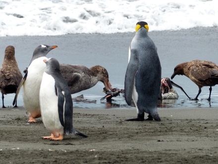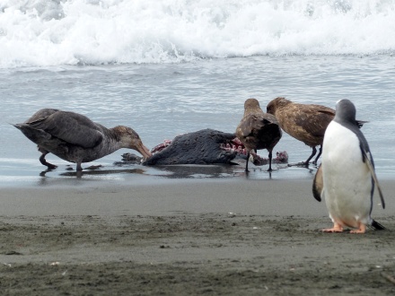 Ein toter Pinguin dient als Nahrung für Riesensturmvögel und Skuas.