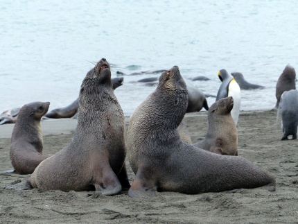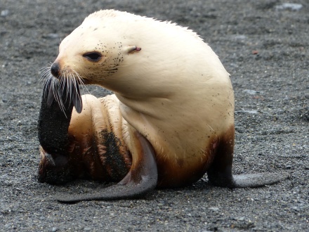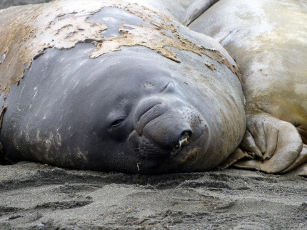 Rechts neben unserer Landungsstelle, die im nördlichen Bereich des Strandes sich befindet, haben es sich die südlichen Seeelefanten breit gemacht. Dieses ist die größte Robbenart der Welt. Die Weibchen werden bis ca. 3,5m lang und ca. 800kg schwer.