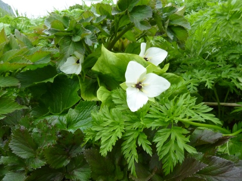 Waldlilien (Trilium) und Korallenwurz (Corallorhiza trifida)