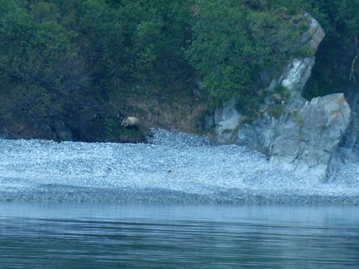 Am Ufer entdecken wir einen Bären, aber für meine Kamera ist das viel zu weit weg.