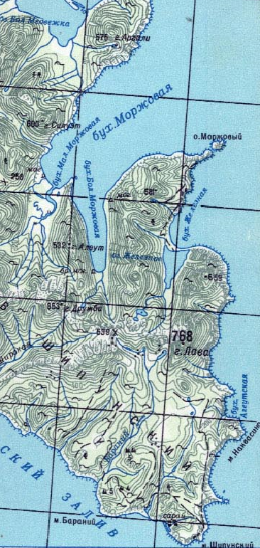 Einige Seemeile nördlich vom Kap Shipunskij im Golf von Kronotsky (68,5km lang und 231km breit) liegt die Morzhovaya Bucht. Der Eingang ist 4 Seemeilen breit und im Norden begrenzt ihn das Kap Argali (мыс Аргли), das sich vom Namen heimischer Bergschafe (Argali bzw. Riesenschaf) ableitet. Im Süden liegt die Walroßinsel (Остров Моржовый).
