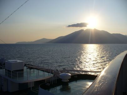 Um 17.40Uhr kam der Lotse an Bord und pünktlich zum Sonnenuntergang wurden wir an die Pier geschoben.