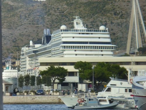 Als wir mit dem Bus zurückfuhren, konnten wir schon von weitem die viele Gebäude überragende MSC Poesia sehen. Dagegen sah unsere Maxim wie ein Beiboot aus. Aber bei den Massen an Passagieren, die aus dem Schiff strömten, freute ich mich, dass wir so zeitig da waren und die Stadt nicht überfüllt erlebten.