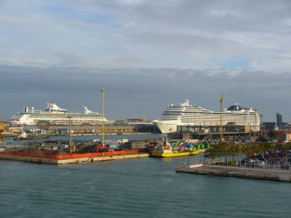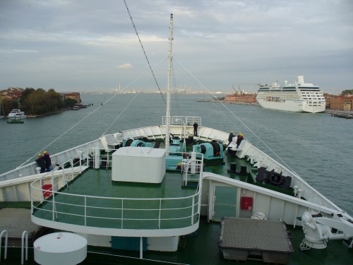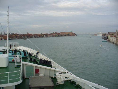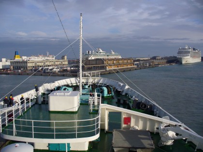 Um 9.15Uhr schwank TS Maxim Gorkiy ihren eleganten Bug nach Steuerbord, um ihren Liegeplatz "Bug an Bug" zur MSC Poesia einzunehmen. Dabei blickte ich traurig zurück in den Kanal auf dem meine letzte Maxim-Reise startete.