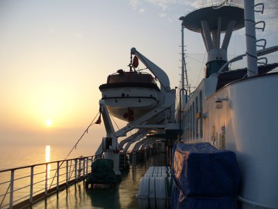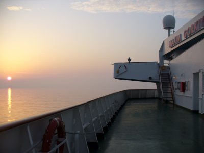 Mit 17,8Kn streben wir unserem ersten Ziel entgegen. Das Mittelmeer ist spiegelglatt und die Sonne schimmert rötlich durch Nebelbänke am Horizont. Es ist unglaublich mild und das Schiff gleitet fast lautlos durch das angestrahlte Meer.