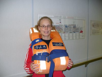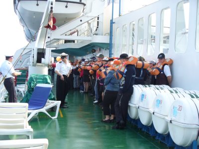 Gegen 14.15Uhr begann die Rettungsübung und wie gewohnt ging es im Gänsemarsch an Deck zu den einzelnen Rettungsbooten. Anschließend fand noch die Übung für die Crew statt.