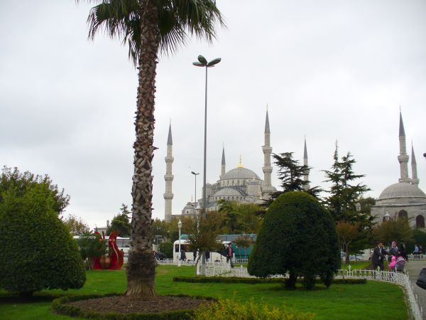 Nun steht die Reisegruppe vor dem Eingang der Hagia Sofia in der Schlange am Kassenhäuschen. Ich drehe mich noch mal um und schaue auf die Blaue Moschee und den davor liegenden Park.