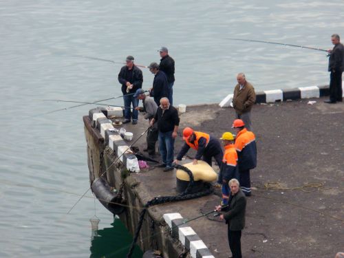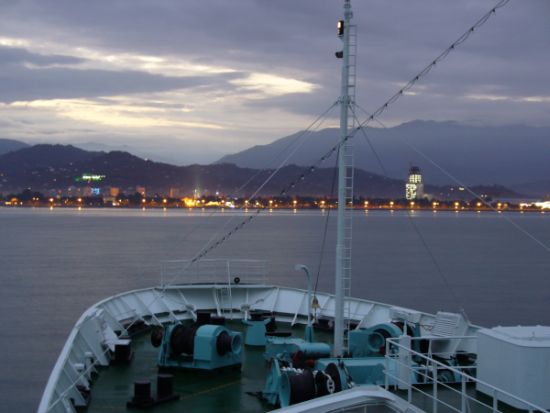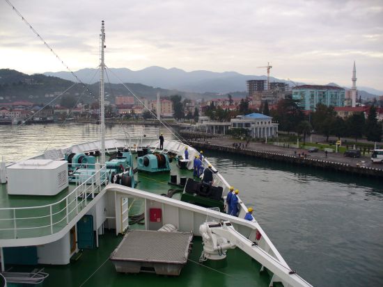 Kurz vor 8Uhr erreichte TS Maxim Gorkiy die Pier, die für Passanten in keinster Weise ISPS-entsprechend abgeschirmt war. Auch ließen sich die Angler in keinster Weise stören. Selbst unsere Festmacherleinen konnten sie nur kurzzeitig von ihrem Platz vertreiben. Es herrschte wirklich ein ungewöhnliches Treiben: eine alte Frau fegte mittels Strohbesen die Pier, Autos hupten beim vorbeifahren und die Leute schauten freundlich zu uns. Das ist nun Georgien - das Land in dem bis vor kurzem gekämpft wurde nahe der Hauptstadt Tiflis und dessen Besuch bis vor kurzem nicht sicher war.