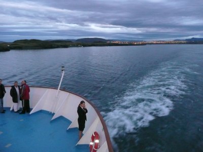 Als ich draußen erneut Pizza aß kam über Lautsprecher eine Durchsage vom Kapitän. Er erzählte uns von einer Sturmwarnung für die kommende Nacht und nachdem ich gesehen habe, dass man den Ankerball vom Vorschiff holte und innerhalb des Schiffes verstaute sowie das bereits jetzt aus dem Pool spritzende Wasser, konnte ich mir vorstellen was uns erwarten würde. Nichts desto trotz habe ich noch lange am Heck gestanden und die hell erleuchtete Stadt angeschaut bis die Lichter von Reykjavik verschwunden waren, die sich wie eine Perlenschnur um die Bucht zogen.
