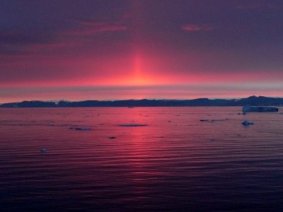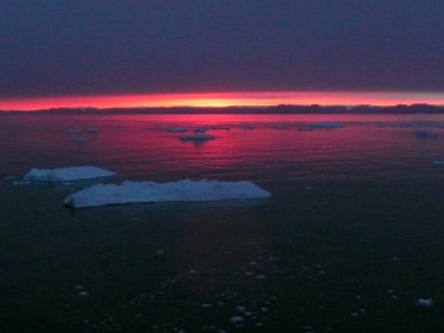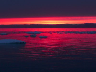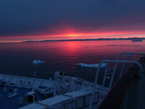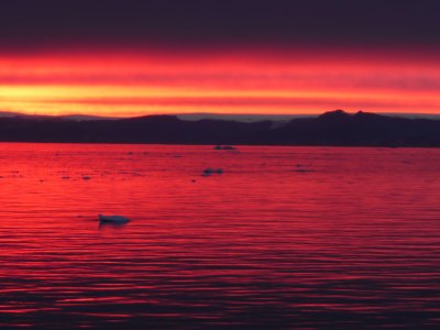Wer mich kennt, weiß, dass ich eine Vorliebe für Sonnenauf- und Untergänge habe. Den nun folgenden Sonnenuntergang in der Disko-Bucht empfand ich neben der Mitternachtssonne am Nordkap und auf Spitzbergen am schönsten. Den ganzen Tag über war es bedeckt und ich hätte mir niemals erträumt, solche leuchtend roten Farben hier oben zu sehen - einfach traumhaft schön...