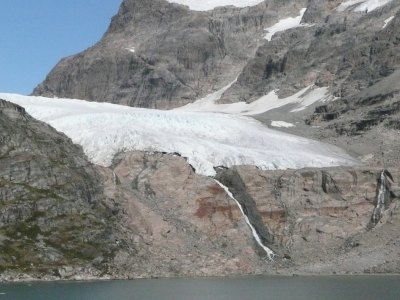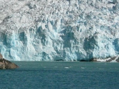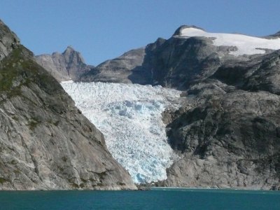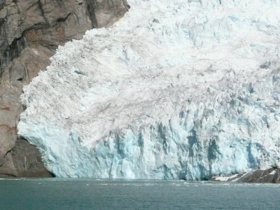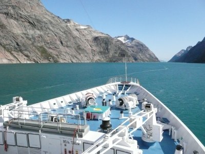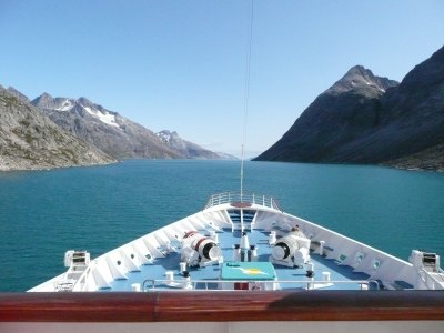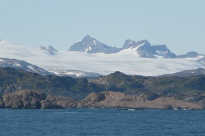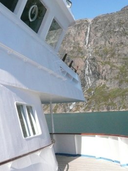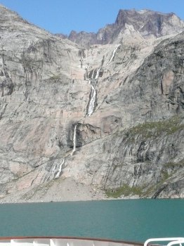 Nach einer großen S-Kurve bogen wir in den eigentlichen ca. 60km langen Prins-Christian-Sund ein. Das Wasser war türkisblau und zwischen den einzelnen Felsen waren immer wieder beeindruckende Gletscher, Abflüsse des Inlandeisfeldes, sowie kleinere Wasserfälle zu bewundern.