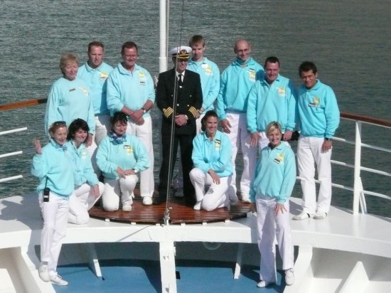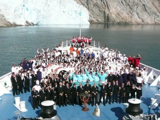 Um 13Uhr erfolgte inmitten des Sundes die Zeitumstellung und ein weiteres Highlight kündigte sich an: Crewfoto. Mit Hilfe eines alten Fotos wurde die Crew entsprechend ihrer Tätigkeiten auf dem Bug vor einem wunderschönen Gletscher positioniert. Ein wirklich schönes Andenken für alle Anwesenden.