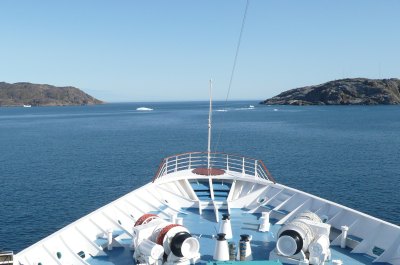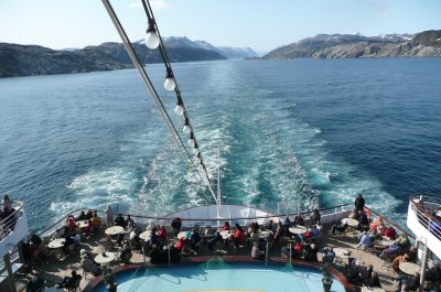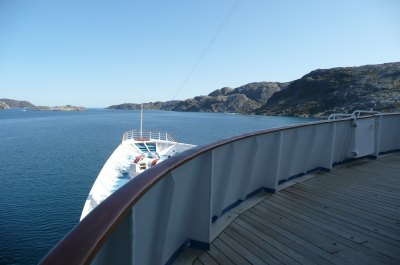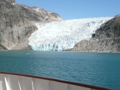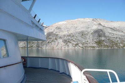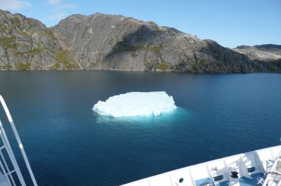 Nun verließen wir wirklich Grönland und wie viele andere auch habe ich noch Ewigkeiten am Heck gesessen und den letzten Anblick auf das Inlandeis und einen großen im Wasser treibenden Eisberg genossen. Das war mein Abenteuer in Grönland. Und ich muss sagen, ich würde es wieder machen. "Im Bannkreis der Arktis" so lautete ein Vortrag von unserem Lektor Thomas Laukötter - mich hat diese eindrucksvolle Landschaft tief berührt.
