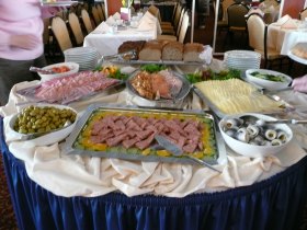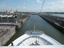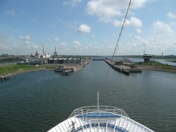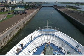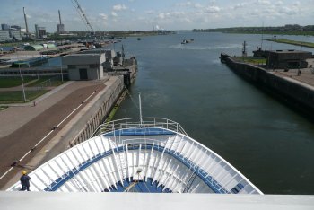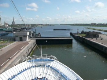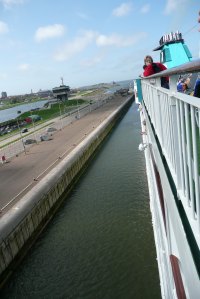 Der Nordseekanal (Noordzeekanaal) verbindet Amsterdam in westlicher Richtung bei IJmuiden mit der Nordsee und im Osten mit dem IJsselmeer. Der Kanal ist ca. 21km lang, ca. 275m und etwa 14m tief und besitzt am Ausgang nur eine Schleuse. Auf Grund des starken Schiffsverkehrs mussten wir vor der schleuse warten. Ein Schleusungsvorgang dauert in etwa 30 Minuten. Diese Wartezeit nutzen wir zum Mittagessen im Veranda Restaurant.