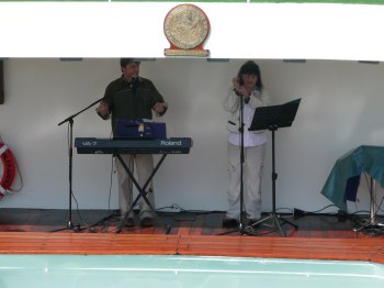 Gegen 11Uhr begann der Frühschoppen am Pool, welcher durch das Duo Romantica begleitet wurde. Kurz danach kam das Lotsenboot. Bei der Verabschiedung drehte es Pirouetten und Alex antwortete mit ihrem Typhon.