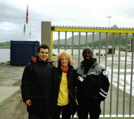 Also nahm ich das erste Tenderboot und fuhr gen Leknes Harbor. Dort angekommen, schaute ich die Bucht an. Auf der linken Seite lag der Ort Gravdal und rechts Leknes. Ich machte mich zu Fuss auf den Weg zur Kirche, die in Gravdal lag. Nach gut einer Stunde erreichte ich das malerisch gelegene Dorf und aß im Supermarkt eine "Rentier-Krabben-Fisch-Salmai-Pizza". Eine einmalige Mischung, aber unheimlich lecker. Weiter ging es etwa 1,5 h Richtung Leknes. Durch die vielen Mahlzeiten an Bord verwöhnt, ging ich in eine norwegische Bäckerei und kostete allerhand süße Leckereien. Leknes wirkt wie eine amerikanische Stadt. Eine Hauptstraße mit den Geschäften links und rechts und dann nix. Nach 4 h erreichte ich dann den Hafen und unterhielt mich mit Joe (aus Liberia) und Mikhail (aus St. Petersburg) über 2h. Wir redeten über Gott und die Welt. Mit Joe schreibe ich noch immer Mails - eine Freundschaft begann.