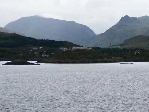 Gegen 11Uhr erreichten wir die Lofoten. Eine felsige Inselgruppe inmitten der oftmals stürmischen See. Bei der Einfahrt in die Bucht von Leknes Harbor, die ich wie immer vorne unterhalb der Brücke verbrachte, entdeckte ich auf der Backbordseite eine kleine Holzkirche auf einem Hügel stehen. Da ich keinen Ausflug gebucht hatte, war mir klar, da muss ich hin.