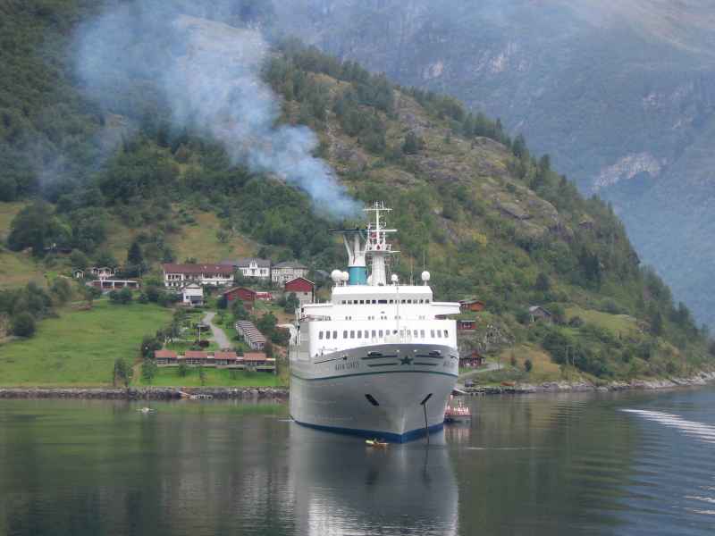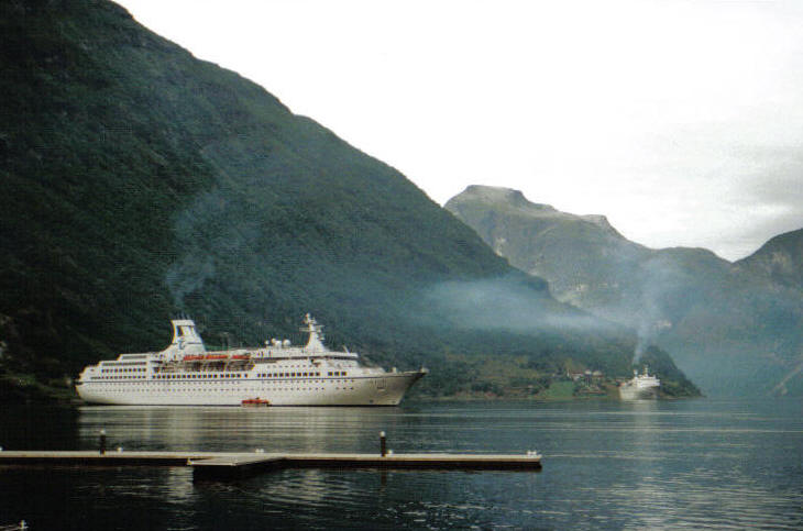 Auf dem Dalsnibba empfing uns ein eiskalter heftiger Wind, der uns relativ schnell wieder in den Bus trieb. An aufrechtes Gehen war kaum zu denken. Dabei fiel mir die Fahrt um das Nordkapp ein, denn auch da stand ich an Deck und konnte mich mühelos in den Wind werfen ohne umzufallen. Später erkundete ich noch den kleinen Ort und erfreute mich am ersten Kreuzfahrtschiff, welches wir trafen - die ASTOR.