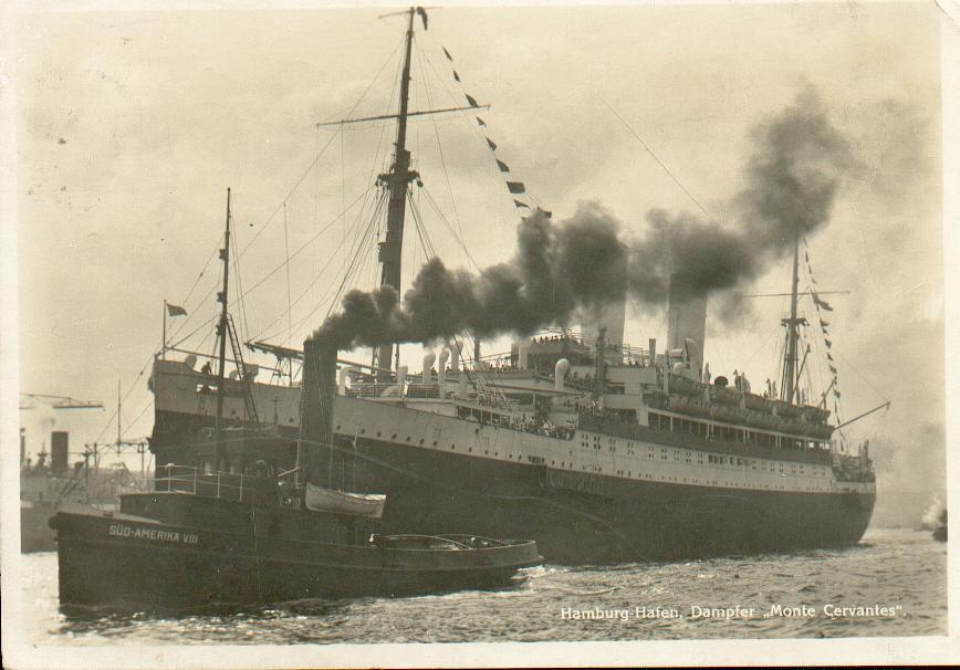 Am 25. August 1927 lief die Monte Cervantes vom Stapel. Sie konnte am 3.Januar 1928 in Dienst gestellt werden. Vier Tage danach begann ihre Jungfernreise in Hamburg, die sie zu den Häfen am La Plata führte. Von den fünf Monte-Schiffen hatte die Monte Cervantes das Pech gepachtet, denn bereits auf der Probefahrt platzte ein Kochkessel.