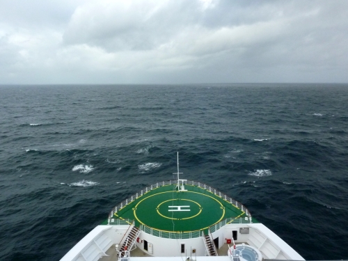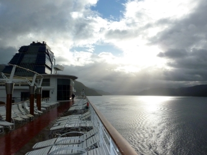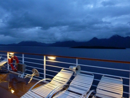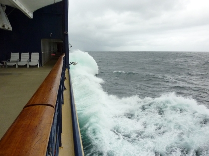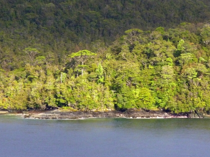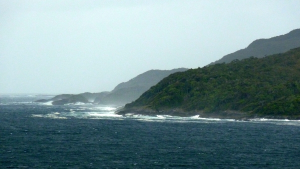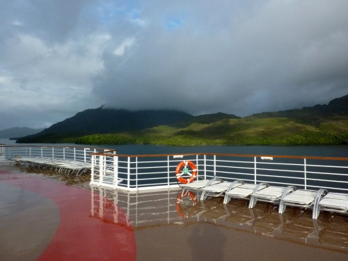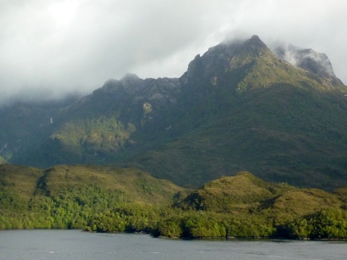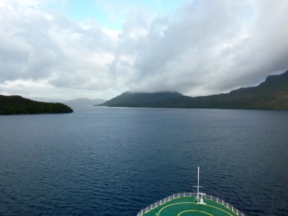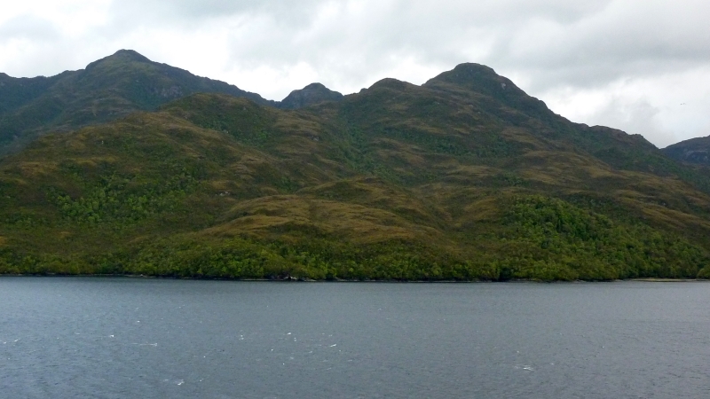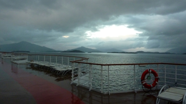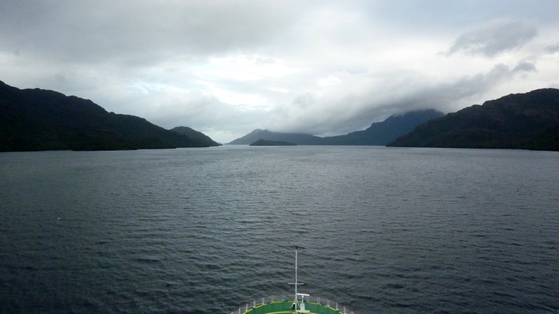 Nachdem wir Puerto Montt verlassen haben, sind wir über den Golfo de Ancud in den Golfo Corcovado gelangt. An diesem Morgen sind wir den 90 Meilen langen Canal Moraleda entlang gefahren, der das Archipel Guaitecas vom Festland trennt. Über Nacht hatte es wieder geregnet und als ich gegen 6.30Uhr an Deck kam, hingen die Wolken sehr tief über den angrenzenden Bergen.