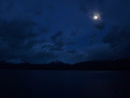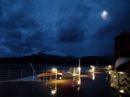 Heute hieß es erneut gaaanz früh aufstehen, denn die Allee der Gletscher im Beagle Kanal wartete darauf, von uns entdeckt zu werden. So stand ich bereits um 4.30Uhr auf und war kurz darauf an Deck, aber wieder erwarten gab es diesmal mehr Frühaufsteher als sonst. Über Nacht hatte es erneut kräftig geregnet, aber trotzdem luckte der Mond zwischen den dichten Wolken hervor.