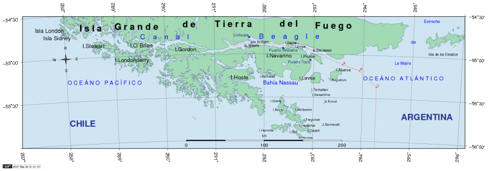 Der Beagle Kanal ist eine natürliche Wasserstraße und verbindet den Atlantik mit dem Pazifik. Den Namen hat er durch das Forschungsschiff HMS Beagle, mit welchem Robert FitzRoy 1831 die Wasserstraße entdeckte. Der Kanal hat eine Länge von 240km.
