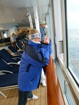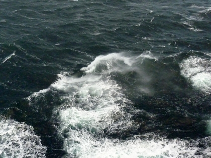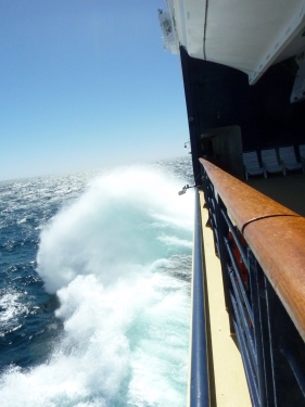 Schon auf dem Weg zu den Außendeck spürte man den heftigen Wind und später erfuhren wir, dass die Windgeschwindigkeit 70kn betrug. Auch das Bild des Wasser belegte dies eindeutig.