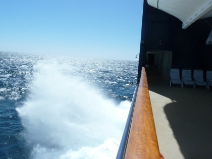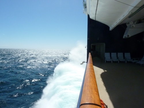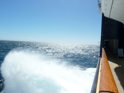 Am frühen Nachmittag zeigte uns der Atlantik bei schönstem Wetter herrlich große Wellen, die teilweise mit großem Knall gegen den Bug klatschten, seine Kraft.