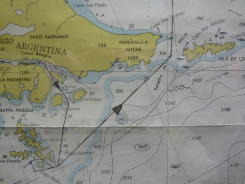 Gegen 12.15Uhr fuhren wir in die Le-Maire-Straße (Estrecho de le Maire) ein. Der 34sm lange Seeweg trennt die östlichen Ausläufer des argentinischen Teils von Feuerland von der islo de los Estados. An der engsten Stelle beträgt die Breite 30,6 km. Dieser Seeweg wurde am 24. Januar 1616 von Jacob Le Maire und Willem schouten entdeckt. Am 29. Januar entdeckten diese das heute passierte Kap Horn.