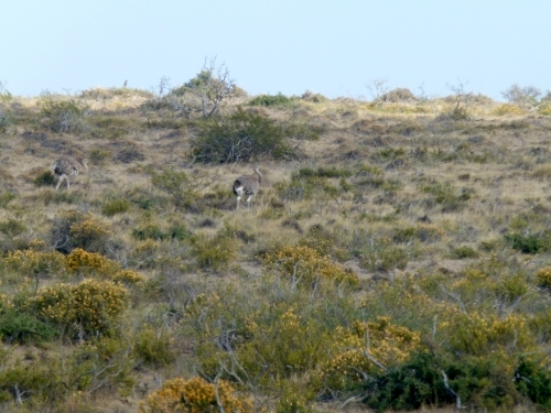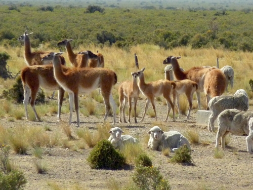Auf der Weiterfahrt entdeckt unser Guide Guanacos, die sich mit Schafen eine Wasserstelle teilen sowie Nadus, die südamerikanischen Verwandten vom Strauß.
